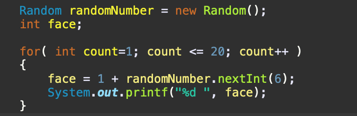 위 코드는 난수를 생성하여 주사위를 20번 던진 것과 같은 결과를 보여준다.