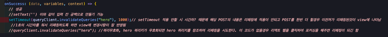 useMutation의 onSuccess 함수 안에 queryClient.invalidateQueries()를 사용하여 쿼리 무효화를 했다.